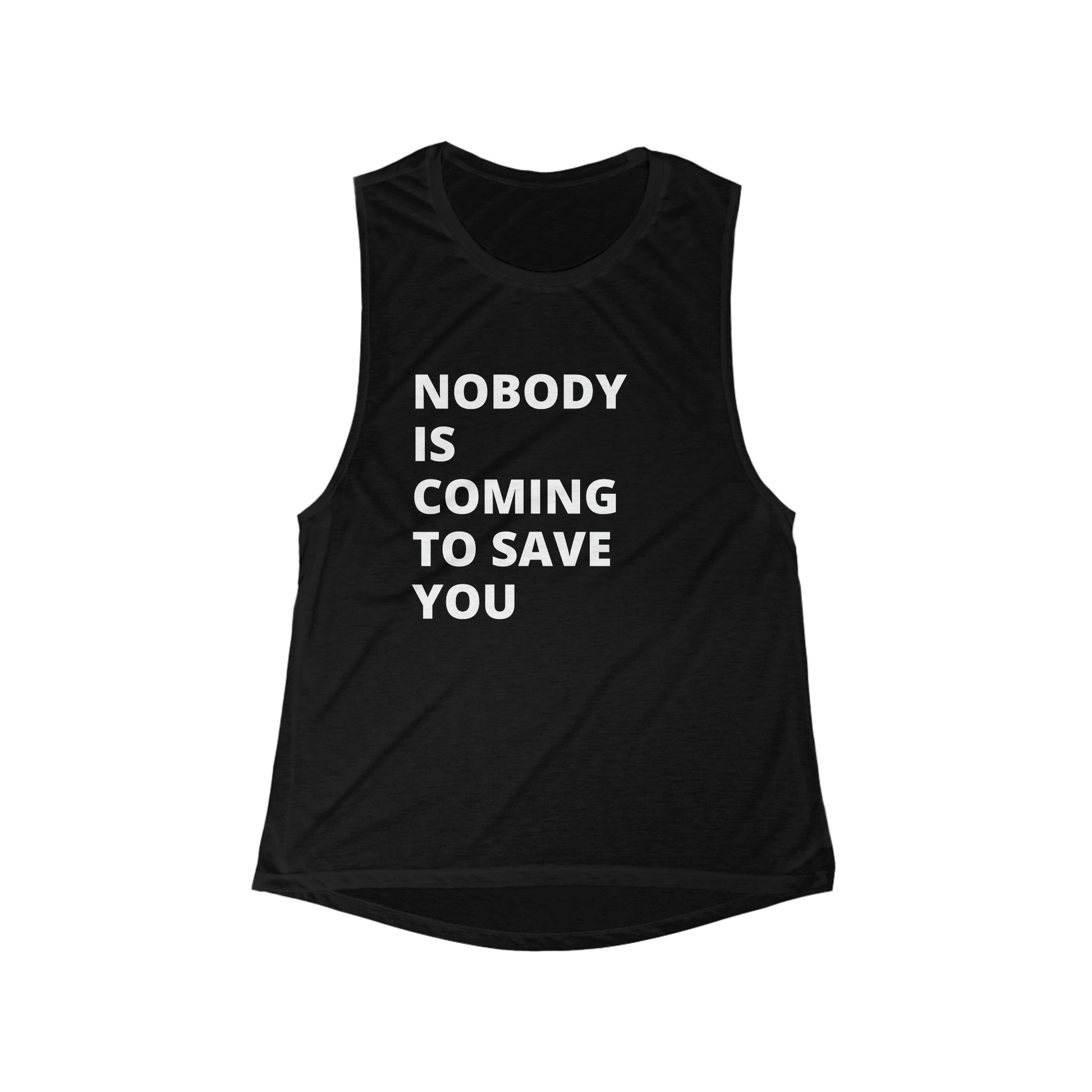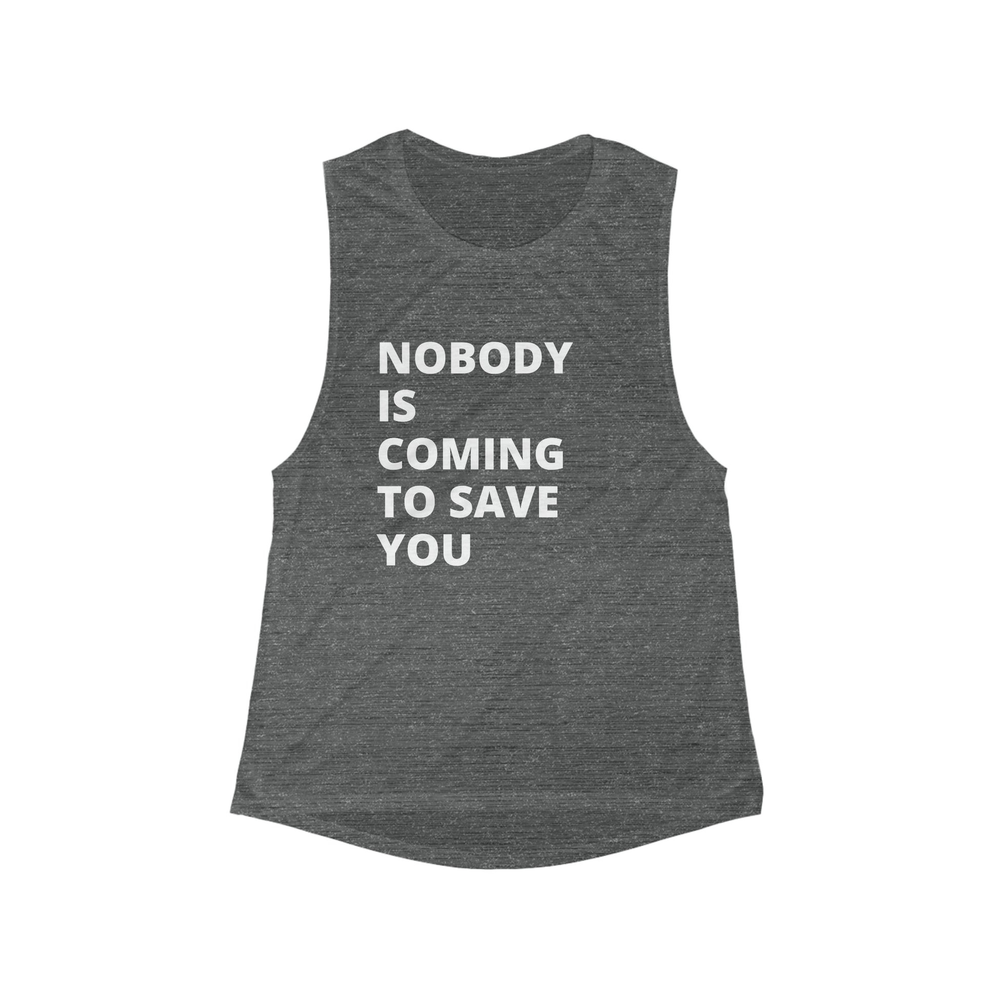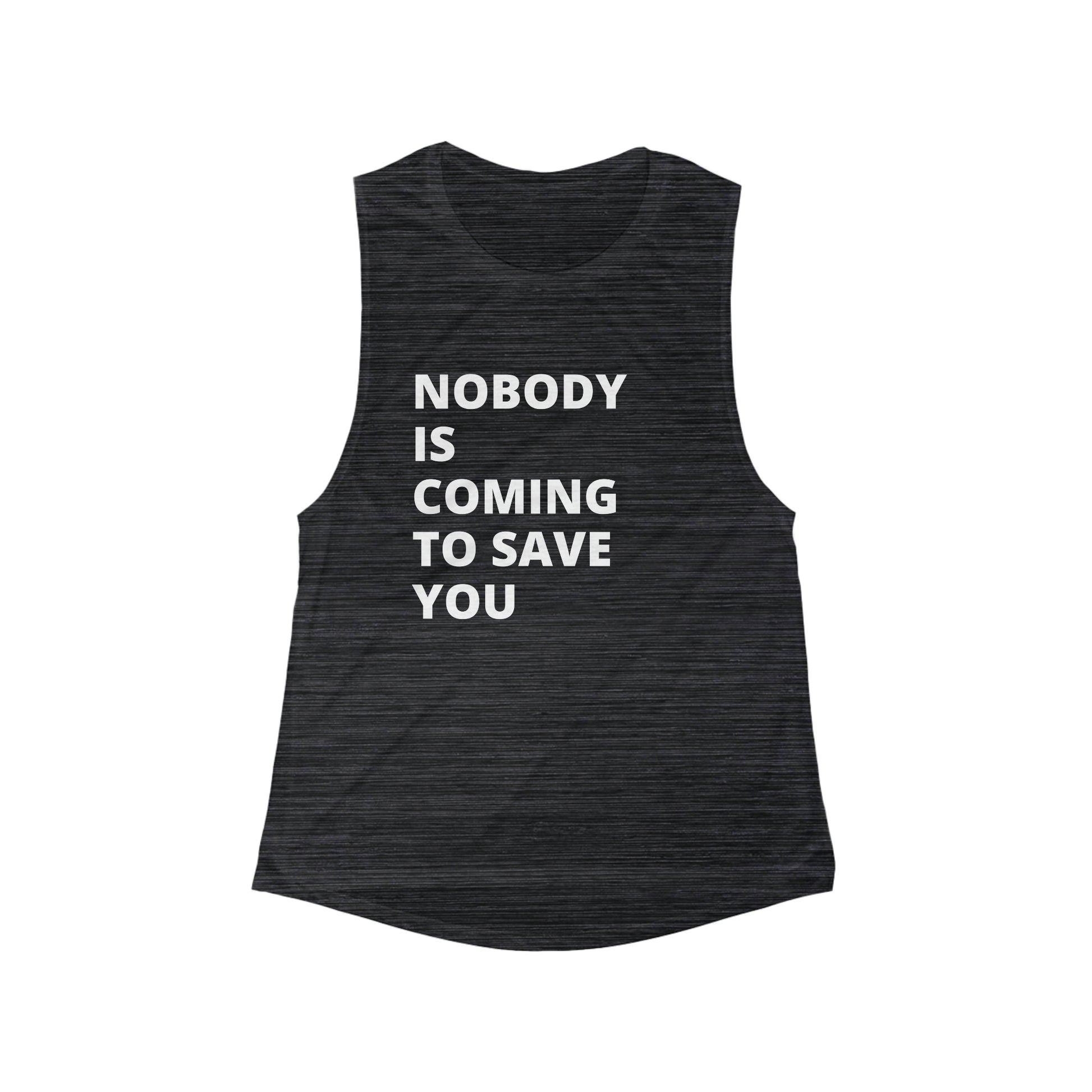 Empower your style with a message of self-reliance and resilience in our "Nobody is Coming to Save You" Flowy Scoop Muscle Tank. This isn't just a piece of clothing; it's a powerful reminder of your inner strength and a call to take control of your own journey.