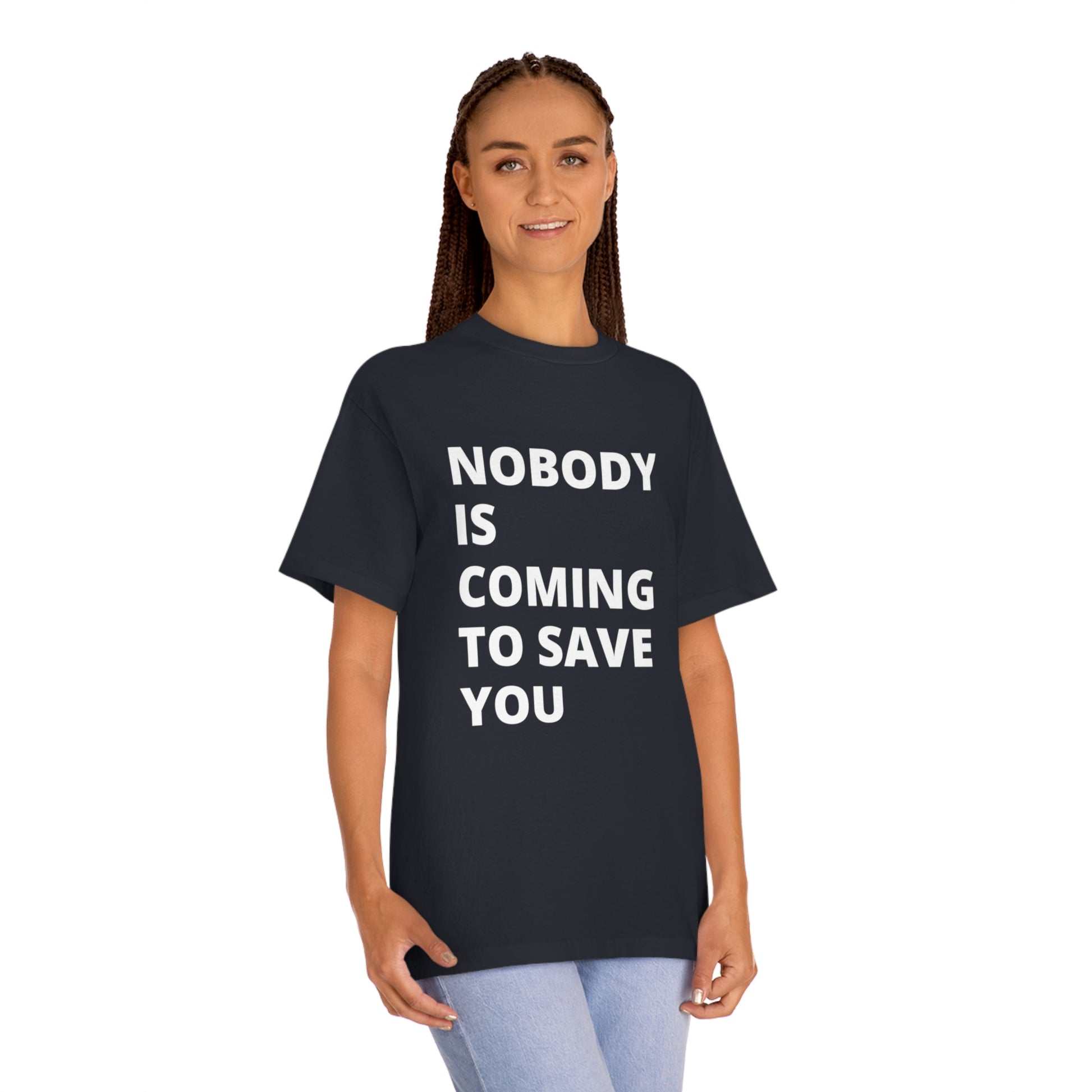 Designed for comfort and style, our classic tee is made from soft, breathable fabric, providing a comfortable and reassuring feel. The message, "Nobody is Coming to Save You," is a reminder that you possess the tools and resilience to overcome challenges, making it a personal mantra for facing life's obstacles.